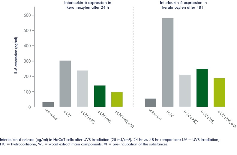 A study from Danz et al. (2001) documents the impact of woad extract: In vitro experiments on keratinocytes and mast cells demonstrate the effect of the main components. The illustration shows the attenuation of proinflammatory interleukin-6 expression after 24- and 48-hour irradiation. The pre-treatment reduces the inflammatory reaction even more effectively. Interestingly, when compared with hydrocortisone, the interleukin-6 expression is even stronger reduced after 24 hours and are similarly effective after 48 hours of exposure to irradiation.